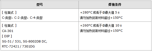 加熱包裝材料至+150°C以上會破壞產品特性或損害諧振器。如需在+150°C以上焊接音叉晶振產品,"MC-30AY 32.7680K-A3: PURE SN",建議使用SMD晶體。在下列回流條件下,對晶體產品甚至SMD晶振使用更高溫度,會破壞產品特性。建議使用下列配置情況的回流條件。安裝這些產品之前,應檢查焊接溫度和時間。同時,在安裝條件更改的情況下,請再次進行檢查。如果需要焊接的晶體產品在下列配置條件下進行焊接,請聯系我們以獲取耐熱的相關信息。