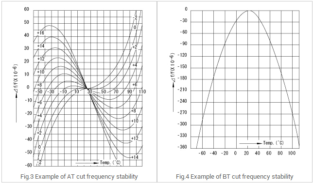 根據(jù)曲線的形狀,將晶體的頻率溫度特性分為2類.一個(gè)是三次曲線,另一個(gè)是二次曲線.典型的頻率溫度特性和BT削減在圖3和圖4所示,分別.在切晶體單元中最廣泛使用的是因?yàn)樗鼈冊(cè)谑覝胤秶鷥?nèi)產(chǎn)生較小的頻率變化響應(yīng)溫度變化.
