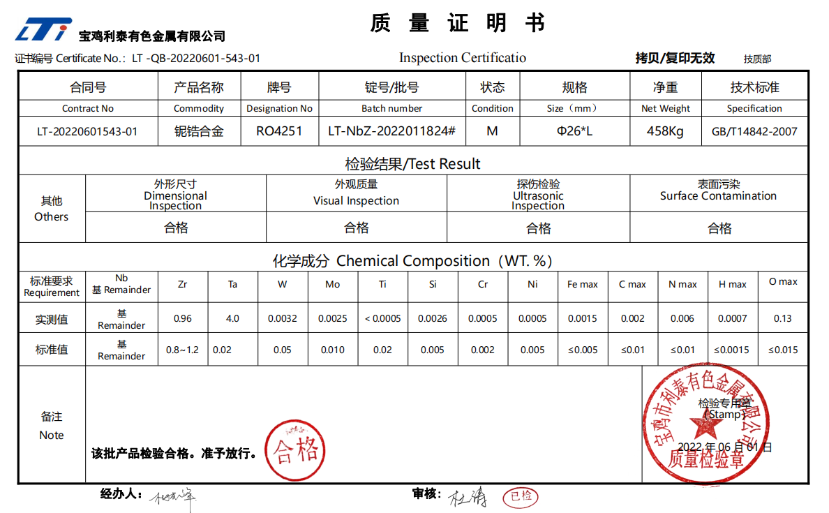 鈮鋯合金執行標準:GB/T14842-2007 、YS/T656-2015