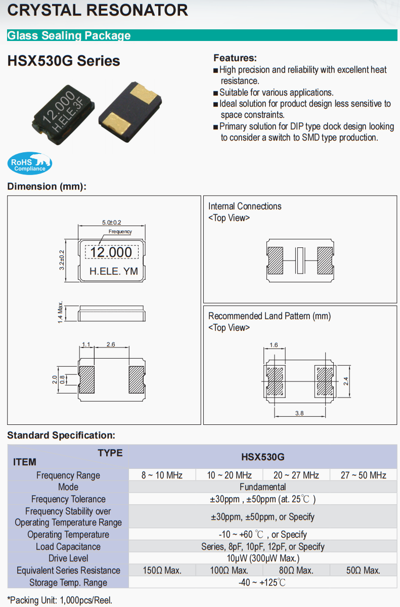 | X1H012000FK1H-X | 加高晶振 | HSX531S | 12 MHz | ±50ppm | 20pF |