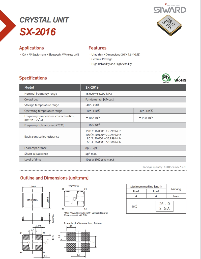 | XTL501300-A292-004 | Siward晶振 | SX-2016 | 16 MHz | ±20ppm | 9pF | -40°C ~ 85°C |