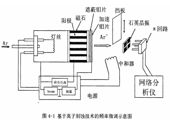 圖4-1是基于離子刻蝕技術(shù)的頻率微調(diào)示意圖[3],晶振離子刻蝕頻率微調(diào)方法,當(dāng)照射面積小于 2~3mm2,在beam電壓低于100V以下就可獲得接近10mA/cm2的高電流密度的離子束,離子束的刻蝕速度在寬范圍內(nèi)可進(jìn)行調(diào)節(jié)。圖中采用的是小型熱陰極PIG型離子槍,放電氣體使用Ar,流量很小只需035cc/min。在:圓筒狀的陽(yáng)極周圍安裝永久磁石,使得在軸方向加上了磁場(chǎng)這樣的磁控管就變成了離子透鏡[17], 可以對(duì)離子束進(jìn)行聚焦。熱陰極磁控管放電后得到的高密度等離子,在遮蔽鉬片和加速鉬片之間加高達(dá)1200V高壓后被引出。并且可以通過對(duì)熱陰極的控制調(diào)整等離子的速度。
