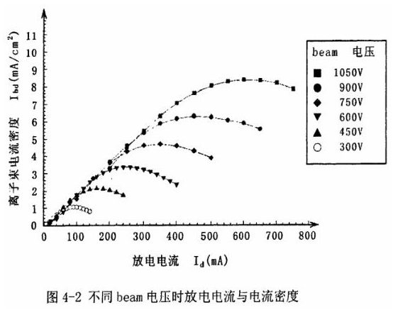 圖4-2表示的是在不同的beam電壓下,隨著放電電流的變化,進(jìn)口晶振的電極膜處(與離子槍加速鉬片的距離為25mm)所測(cè)得的電流密度。從圖中可以知道,對(duì)于不同的beam電壓,放電電流變化時(shí),都有相對(duì)應(yīng)的放電電流使得電流密度達(dá)到最大。本文說所的離子刻蝕頻率微調(diào)就是采用了各不同beam電壓時(shí)的最大電流密度進(jìn)行的。當(dāng)設(shè)定好調(diào)整速度后,根據(jù)計(jì)算決定beam電壓,然后根據(jù)該電壓下最大的電流密度計(jì)算出放電電流。