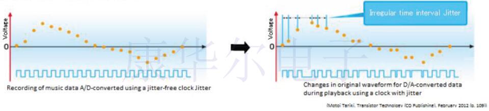 頻率穩定性(頻率在延長的時間內不會變化的特性)通常被視為晶體振蕩器的重要屬性.但是,音頻設備需要短期而不是長期的穩定性.在這樣的背景下,通常將頻率穩定度約為±30~±100ppm的SPXO(*4)用作主時鐘.高端音頻系統可能會配備OCXO(*5)來獲得更高質量的聲音.