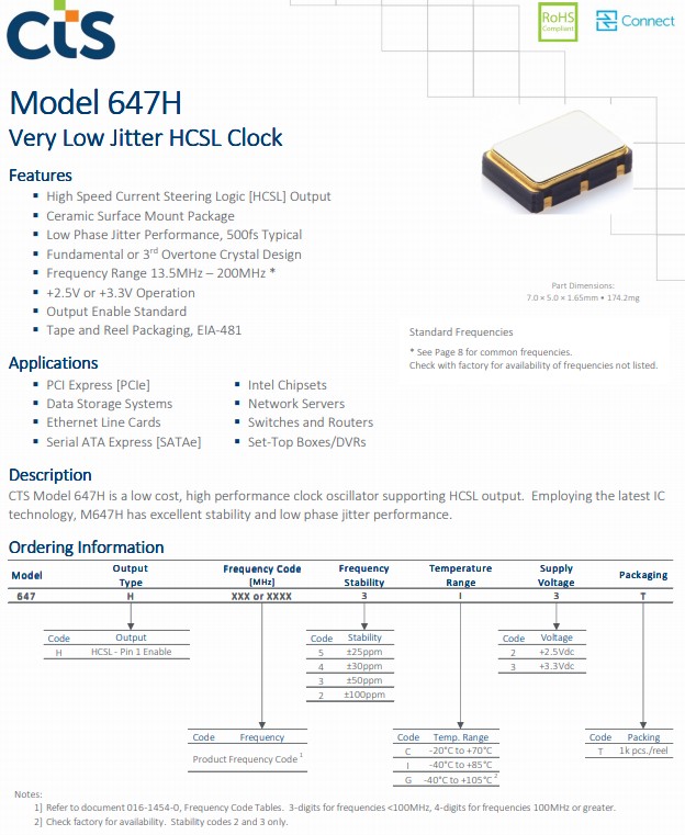 CTS Models 643H, 645H and 647H offer stability options of ±20, ±25, ±30, ±50 and ±100ppm, input voltages at +2.5V or +3.3V and typical phase jitter performance of <500fs.  Along with standard commercial and industrial temperature range options, these new models also support the extended range of -40°C to +105°C for fan-less applications. Standard product features, common market applications and new series platforms are summarized below.  Please refer to individual data sheets on the CTS website to view more performance characteristics.